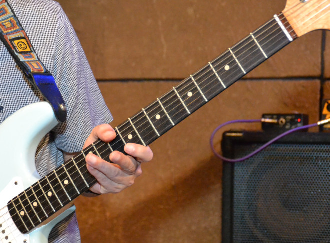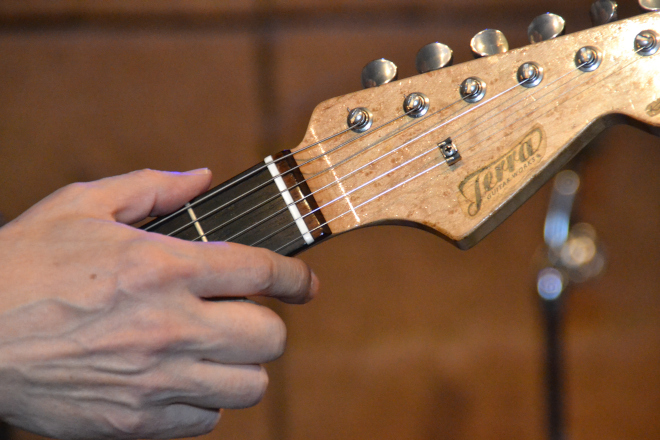 森園:日本ではストラトを使っている人でも、たぶん.010~.046のゲージの人が多いんだろうけど、僕はあまり指の力がないから。あと、ボトムが太いと低音が出すぎてベースの音が聴こえなくなっちゃう。なるべく周りのみんなの音を聴きながらやりたいんです。セッションは自分の音ばかり聴かないで、みんなで雑談しているつもりで他人の音を聴くといいですよ。