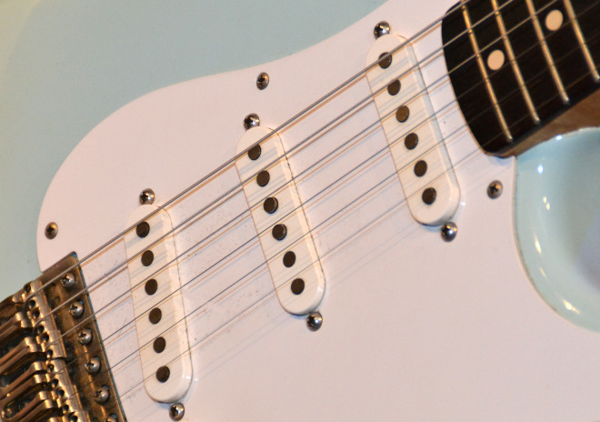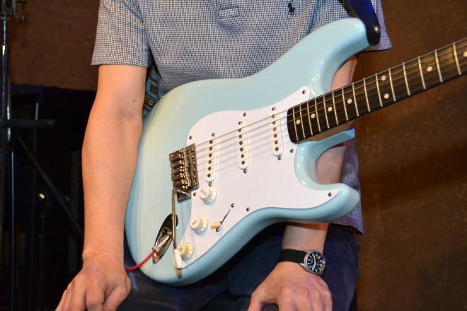 森園勝敏(以下、森園):東京・西荻窪にあるギターズマーケットというビンテージギター屋さんが作っているモデルです。ここは昔からの友達でよく出入りしていたんですが、15~16年前にその店でオリジナルギターを作ることになった。それで1本使ってみてくれと言われたのがこのストラトキャスターです。まず色が気に入りました。ソニックブルーは前から欲しかった色なんです。使ってみてもすごく良かったので、それ以来このギターをメインで使っています。ボディとネックはワーモスという、フェンダーのカスタムショップなんかにパーツを卸しているメーカーのもので、ネックはよく見るときれいなバーズアイメイプル。指板はハカランダです。