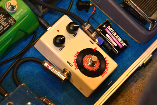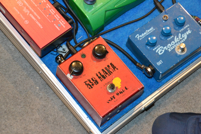 森園:手前の3つが歪み系です。この3つはローがカットされないところが好きです。一番よく使うのはWAY HUGEのRED LLAMAで、これは音的な特徴はそれほどないんだけど、しっかりオーバードライブがかかる。青いBrooklynはもうちょっとざらざらした音。それでも足りないとき、サスティンがもっと欲しいときはこの白いファズを使います。これは&K. LaboratoryのAnalog Faceという、FuzzFaceのクローン。ライブハウスに行くと、置いてあるアンプがみんな違いますけど、この3つがあればどれか一つはアンプにマッチしますね。