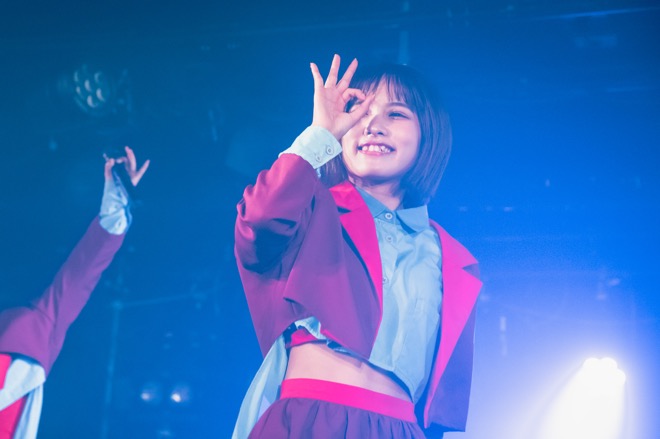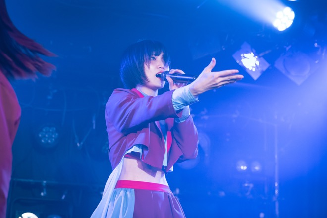 ここで、昼公演にて一足先に初披露されていた新曲「さめないワナビー」のファンタジックな空気に包まれると、先ほどのMCで笑いを誘った彩負屋ねむりが、ひとたび曲へと突入すればスマートなダンスと歌でアプローチ。「圧倒」へと続き、拳を掲げたり足を蹴り上げたりして怒りを吐き出す力強さの中で、切兎うずめのキリッとした鋭さも映えていた。等身大の強い感情を後押しするロックサウンドが美味しい曖昧の楽曲の魅力であるが、そこに負けず劣らずの存在感を持った幽花はるかの歌声も頼もしい。「あまあま」では、曲の冒頭でいつも盛り上げる言葉を投げかけてくれる凡やよいが曲中でもしっかり先導。1人ひとりが得意な表情でアプローチする“私だけを見て”なシーンにも釘付けにされてしまうキラーチューンのひとつでもある。