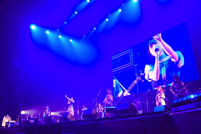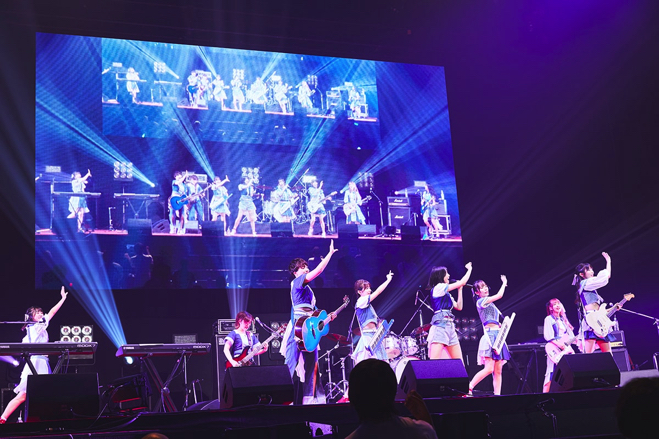 メンバー紹介を挟み続いて披露されたのは先日7月30日にリリースされた「アイスちょうだい」のカップリング曲「secret base 〜君がくれたもの〜」。夏のガールズバンド曲として長年愛され続けている名曲を、10人でしっとりと演奏。哀愁あるサウンドに、ボーカル船井の切ない歌声がハマり会場中が楽曲の世界に誘われているのがよくわかる。聴いていると、いろいろな夏の思い出が一気に溢れて、エモくなるそんな感覚にさせてくれた。