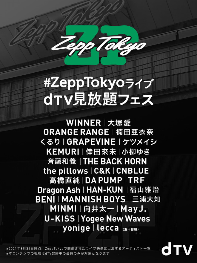 国内外のアーティストが約23年間にわたってライブを行ってきたZepp Tokyoには、これまで約1,300万人が来場したといわれている。dTVは今回、Zepp Tokyoでライブを楽しんだ多くのファンが大切な場所での思い出を振り返ることができるよう、同会場で行われた31アーティスト・84公演のライブをとりまとめ、「#ZeppTokyoライブ dTV見放題フェス」として発信する。