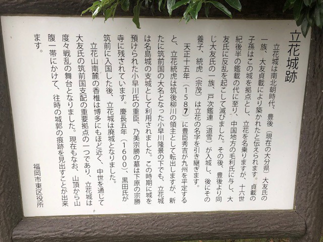 築城は古く、立花氏により1330年頃と言われている。367メートルの山の峰に100以上と言われる程の曲輪が設けられており、城内も相当な大きさを誇る。たくさんの争いがこの城で起きたが、1500年代後半に小早川氏が入城、そこでいくらか整備されたのが今の形とも言われている。今でも残る石垣は小早川氏の手によるものだそうだが、1601年、博多を黒田氏が治め、時代が山城から平城に移り変わる中で立花山城は廃城となる。耳寄りな情報としては福岡城の石垣は立花山城の石垣を用いて作られているとのこと。現在残っている立花山城の石垣は土砂崩れを起こさない場所にだけしっかり残っていて、主要部分は土塁に戻っているので、おそらくこの土塁に打ち込んであった石垣を福岡城に持って行ったのだろう。とても興味深い話である。俺が若い頃からずっと愛用し使い続けてきたラジエター、そして踏み心地最高なクラッチペダル、良いから持っていけよって引退したドライバーが若い奴にくれてやる時の感じやないか。その日から瞬きを1回したらポールポジションだった、やないか。