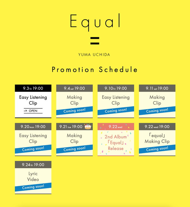 内田雄馬が9月22日(水)にリリースする2ndアルバム『Equal』のプロモーションカレンダーが公開された。