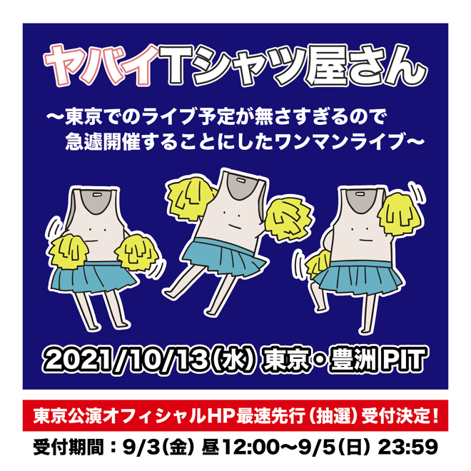 公演詳細、注意事項: https://yabaitshirtsyasan.com/tokyo/