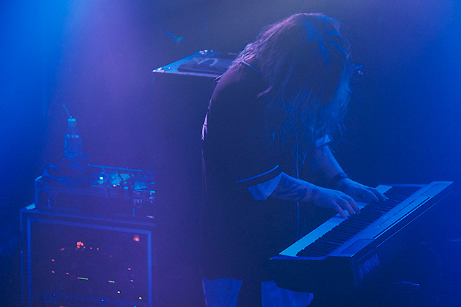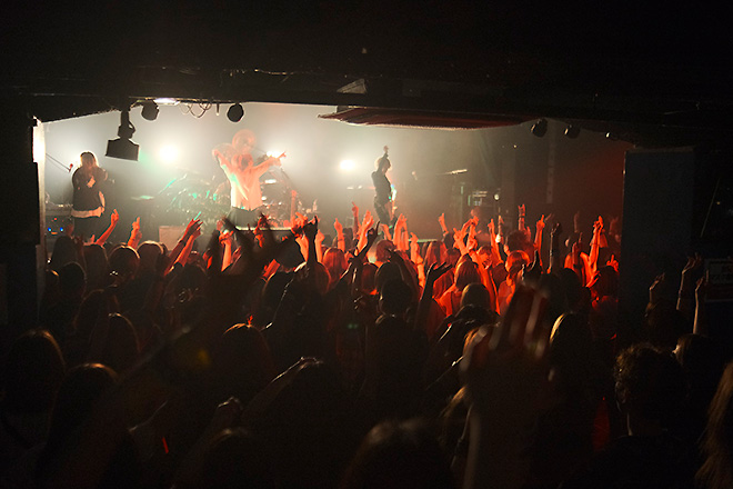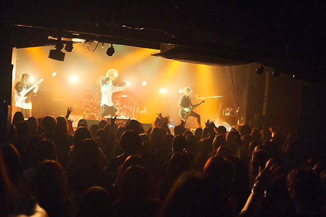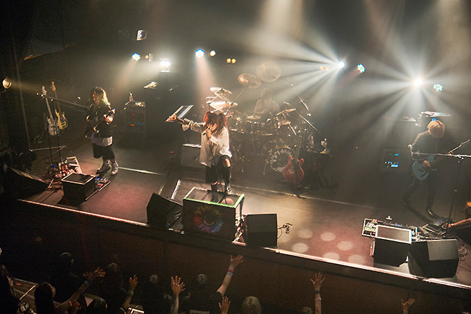 殺伐と重く歪んだ音像の中に、2013年の発表当時から彼らが一貫して描いてきた死生観の滲む「「絶蘭」」からライヴがスタート。ダイナミックかつグルーヴィーなSacchanとMiyakoの弦楽器隊が織りなすユニゾンが派手に炸裂する「Thirsty?」、SORAのワイルドなドラムが楽曲の持つメッセージをより強調していく「カメレオン」と続いたところで、千秋が述べたのは以下の言葉だ。