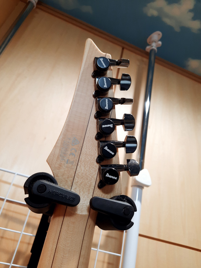 自動で弦を切ってくれるロックペグと、珍しいボールベアリング式(他にはおそらくヴィジェくらいでしょう)のノンロッキングトレモロを搭載した一本です。正直これ以上にスムースなトレモロは無いと思っています。
