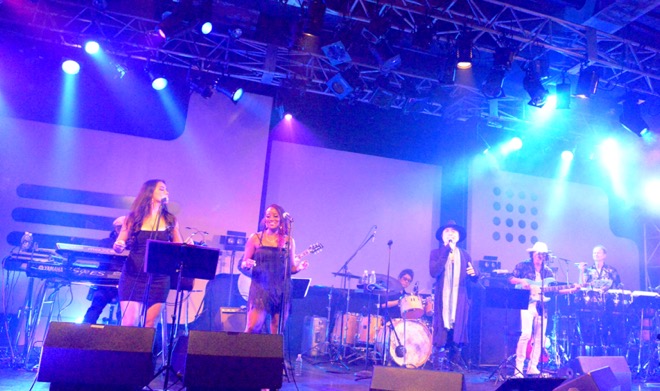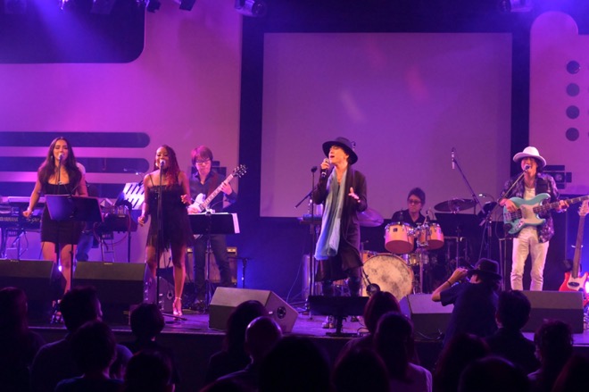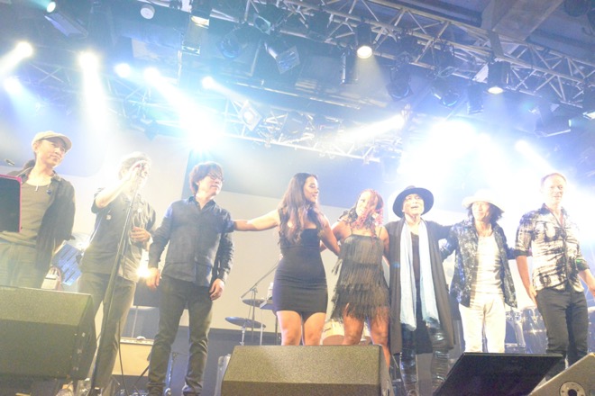 さらにグルーヴの表現の仕方にまで絞ると、これは非常に興味深かった。真剣な表情で的確に演奏しながら音でノリを出してゆくメンバーと、常に笑顔で身体全体でノリを見せるメンバーに分かれていたのだ。後者は西村とコーラス隊とベースの日野。要はアメリカ生活経験者だ。日野も日本生まれながらニューヨーク育ちで、ジャコ・パストリアスなどともセッションしたことのある人物。笑顔を絶やさないことも含め、やはり“向こうのノリ”というのは確実にあるようだ。ベースを弾いてる日野に「オレにも弾かせてくれ」と西村が迫るパントマイム的な寸劇も、日本ではなかなか見れない類のものだと感じた。