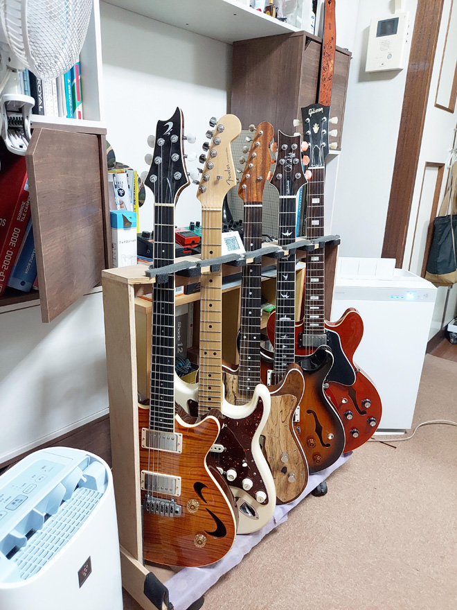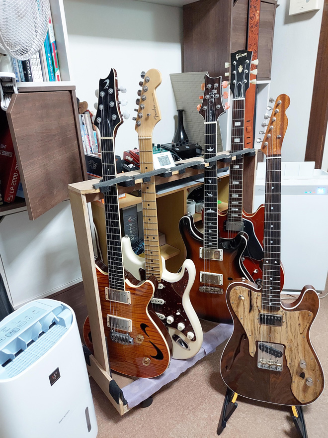 ネットで所有本数のギターを掛けられるスタンドを探しましたが、当時フルアコを持っていてサイズ的にどうしても2~3本分のスペースを取ってしまい また狭く気に入るものが無く、自作か?やってみるか?で挑戦。フルアコL4cesは、売ってしまったので今は、こんな感じでお行儀よく並んでます。gibson Fender PRSに長野T’sguiterそしてnon ブランド テレキャスシンライン