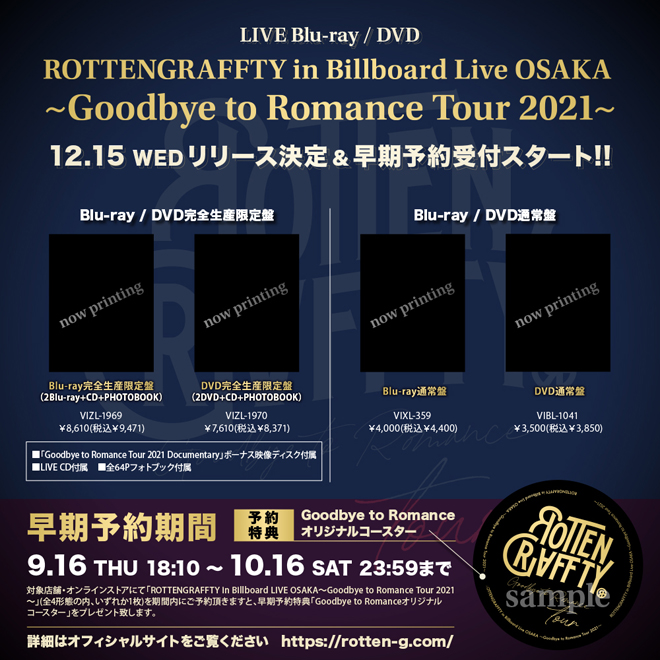 下記対象店舗・オンラインストアにて、「ROTTENGRAFFTY in Billboard LIVE OSAKA〜Goodbye to Romance Tour 2021〜」(全4形態の内、いずれか1枚)を期間内にご予約頂きますと、早期予約特典「Goodbye to Romanceオリジナルコースター」をプレゼント致します。(Amazon.co.jpの特典は「ビジュアルシート」になります。)