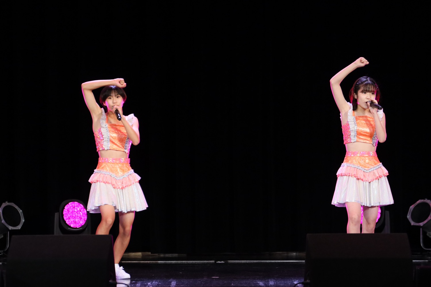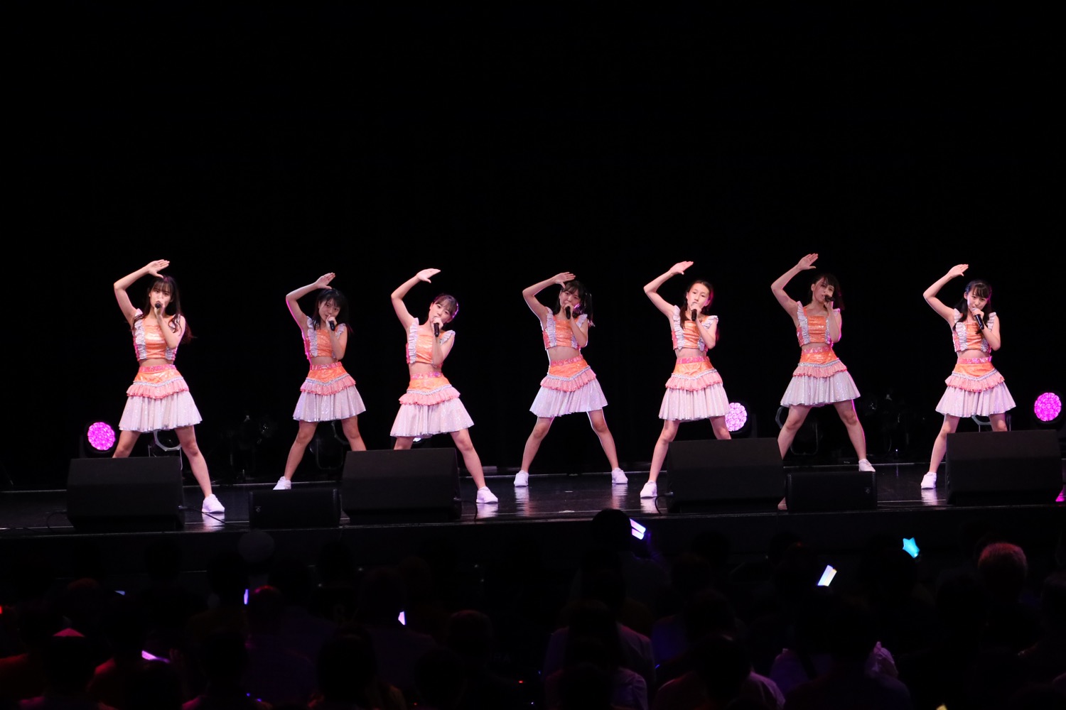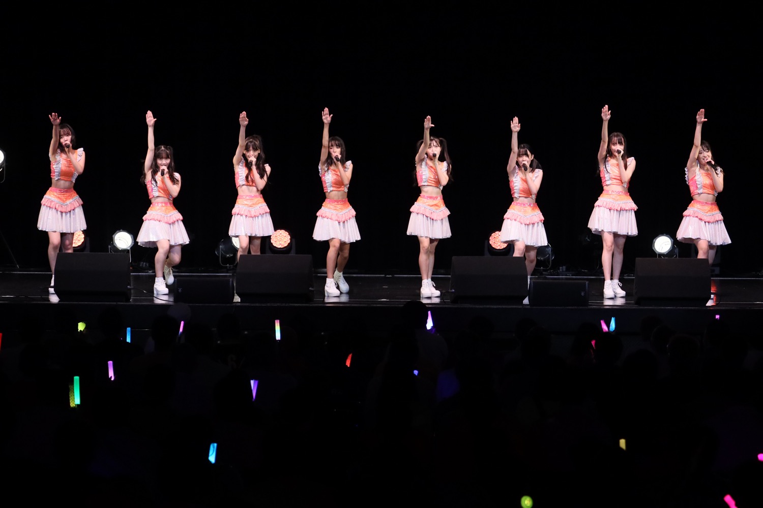 公演終盤では「表参道 A5」「情熱スパークル」のテイストがまったく異なる2曲をそれぞれしっかりと歌い分けながらパフォーマンス。7名の明るい笑顔が弾け、ラストは出演者全員による「Upside down girl」で幕を下ろした。