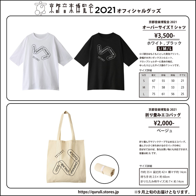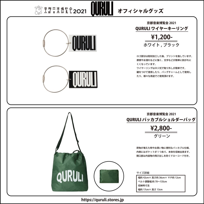 この発表に合わせ、<京都音博>の新グッズの販売もスタート。新たに加わったグッズはワイヤーキーリング(ホワイト・ブラック)、パッカブルショルダーバッグ(グリーン)の2種類だ。
