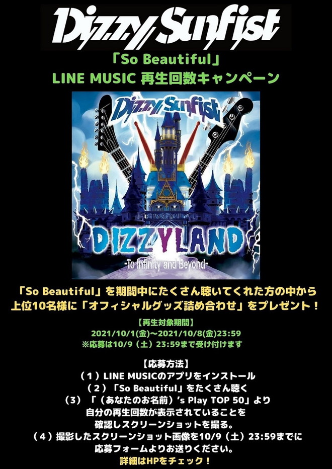 10月1日(金)にDizzy Sunfist のニューアルバム『DIZZYLAND -To Infinity & Beyond-』から先行配信される「So Beautiful」をLINE MUSICで期間中にたくさん聴いた方、上位10名に「オフィシャルグッズ詰め合わせ」をプレゼント。