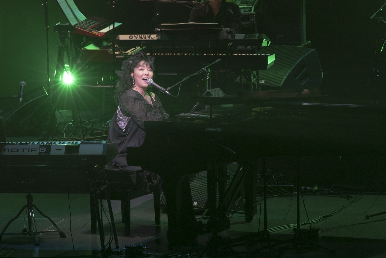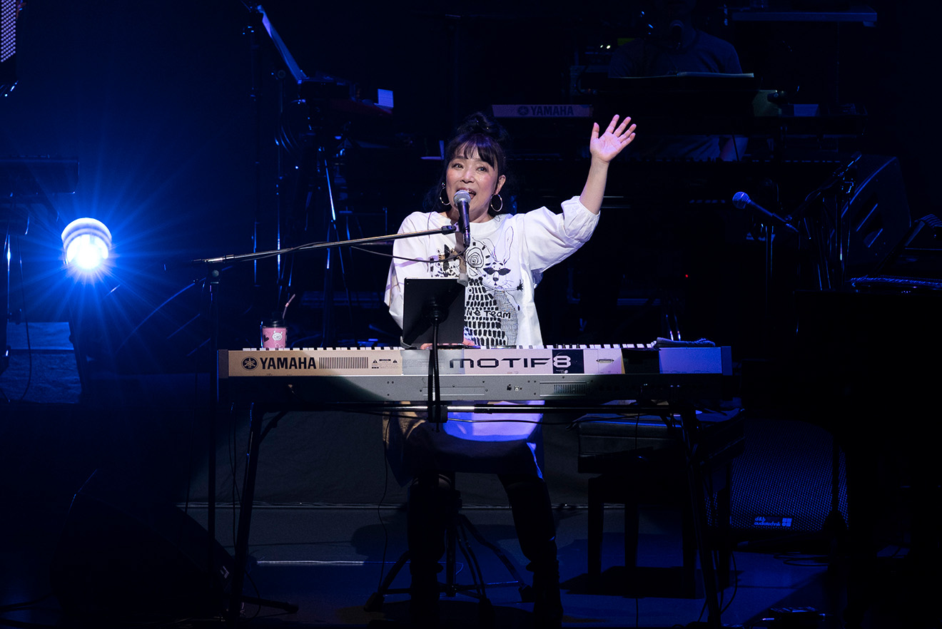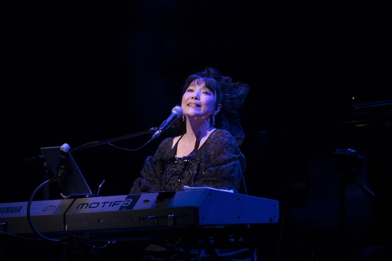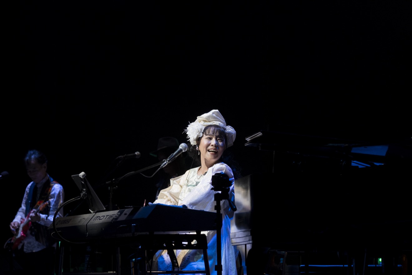 その言葉のとおり、高揚感のある歌を届けられる。MCではアルバムが発売されたばかりだということもあり、FCの方々からリクエストを募ってセットリストを組んだと話し、バンドのメンバーを紹介したのだが、トークが彼女らしくユーモアたっぷり。レジェンドの括りで紹介されたのは鈴木茂(レジェンド1)、林立夫(レジェンド2)、小原礼(レジェンド3)で、伴侶でもある小原礼は「公私ともにサポートしていただいています。悪口なんか言えるはずもありません」と紹介され、「もうちょっとでレジェンド。この中ではまぁまぁ若輩です」と言われたのは是永巧一。奥田民生など多くのビッグミュージシャンのサポートを務めるキーボーディスト、斎藤有太には「男子の中でいちばん若い。念願かなって再度参加してもらうことができて幸せです」とコメント。矢野顕子からプレゼントされた衣装を着ているというAisaは才能溢れるミュージシャンと紹介された。