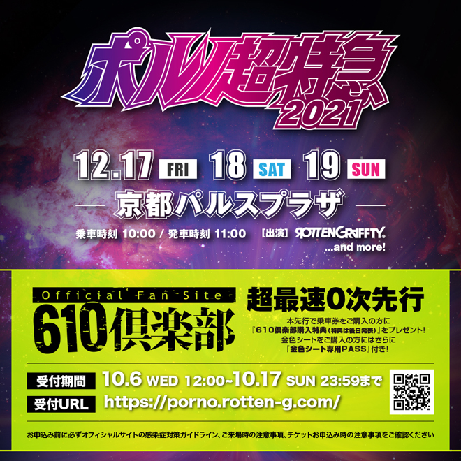 新型コロナウィルスの影響により、昨年2020年は開催が見送りになった<ポルノ超特急>。今年は「開催に向けて調整中」というアナウンスがされていたが、開催が正式に決定し、12月17日(金)、18日(土)、19日(日)の三日間にわたり京都パルスプラザにて開催される。出演アーティスト等は追って発表されるが、本日10月6日より610倶楽部ではチケットの“超最速0次先行”受付がスタートした。同時に、新型コロナウィルス感染症対策ガイドラインも発表されており、チケット等さらなる詳細はオフィシャルサイトからチェックを。