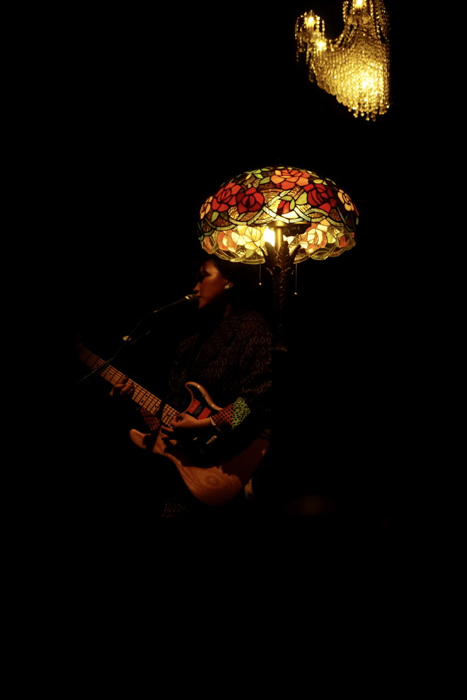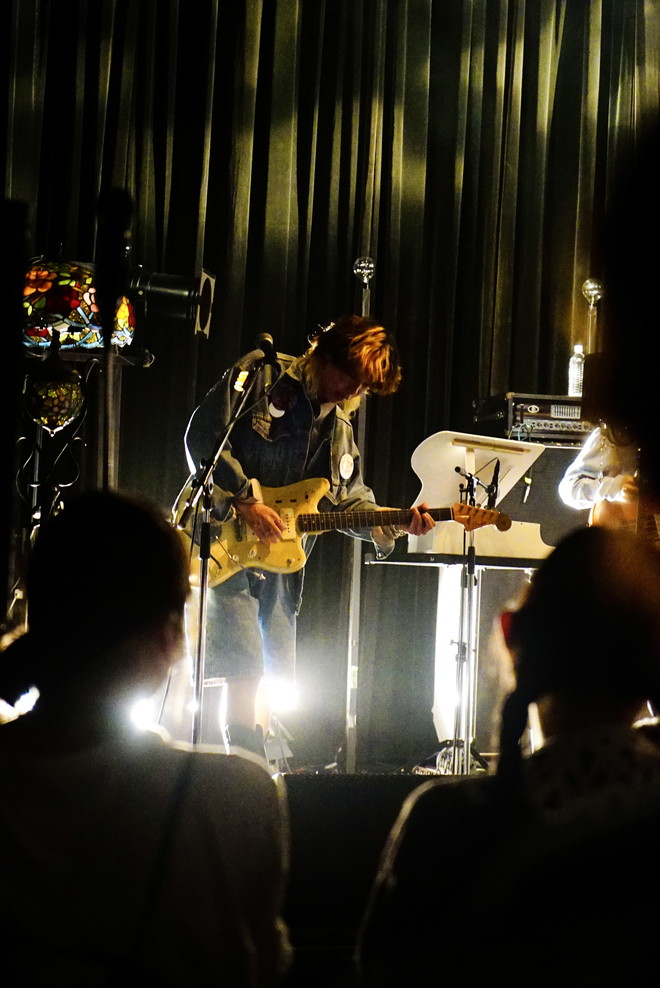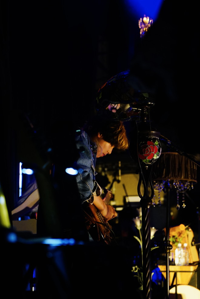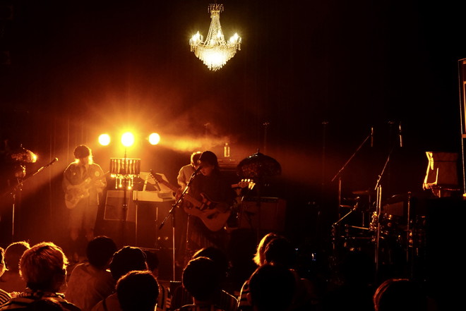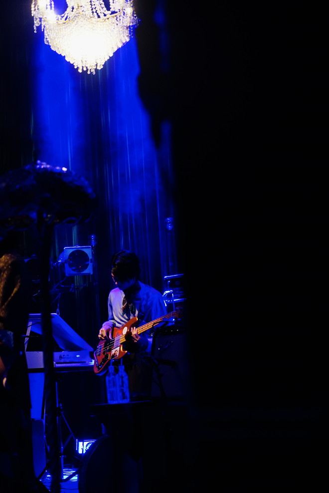 客電が落ちると、天井のシャンデリアが白く輝くステージにメンバーが登場し、比喩根(Vo&G)による優しいギターのアルペジオが響く中ライブはスタート。比喩根の艶のある歌声をジャスティン(Dr)のドラムが少しずつ盛り上げ、小崎(B)のベースが奥行きを与えると、玲山(G)のギターが歌うように鳴る。情感たっぷりに最初の曲を演奏し、一発でフロアを非日常的空間に誘い込んだ。