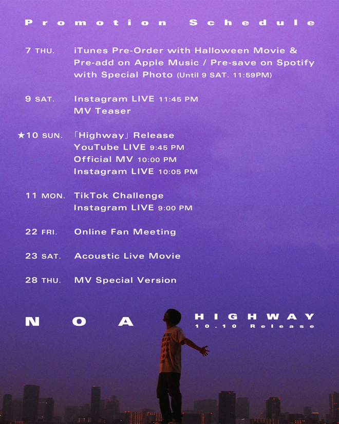 「Highway」は、8月にリリースされた「LET GO feat. JEON WOONG (AB6IX) 」と9月にリリースされた「Don’t Waste My Time」に続く、3か月連続デジタルシングルの第3弾となる楽曲だ。NOAは次のようにコメントしている。