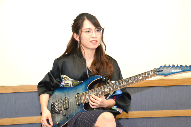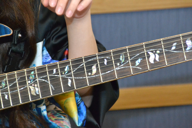 葉月:試奏するときにどれが手になじむか色々試していたら、たまたま弾きやすいなと思ったギターがエクストラロングだったんです。そのスケール感に近いものをアイバニーズで探して、ロングスケールのものを見つけたんです。それが以前使っていたモデルです。でもやっぱり今になって考えると、レギュラーのほうが合っていたんだなと(笑)。それと、ロングスケールのギターだと、どうしても親指を大きく開いて弾くことになるんですが、それで左手の親指が腱鞘炎になってしまったことがあるんです。私の親指はもともと二重関節で、逆にもすごく曲がるし、ときどき関節が外れたりすることもあるんです。ロングスケールを使うのは指には悪かったのかもしれませんね。