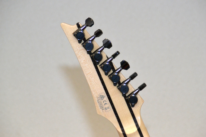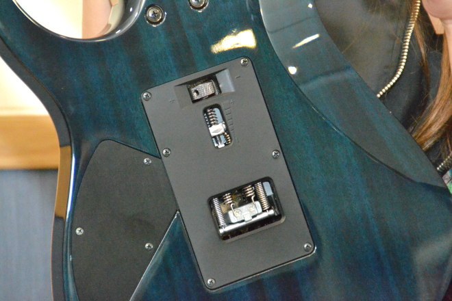 葉月:大きかったのは、Edge-Zeroというトレモロブリッジがついていることですね。ゼロ・ポイント・システムといって、アームダウンのときに伸びるスプリングのほかに、アップに対応するスプリングもあって、両方でバランスを取っているのでチューニングがとても安定しているんです。それと、とくに魅力だったのがスプリングのテンションを簡単に調整できることです。普通はドライバーでネジを回してテンションを調整するんですけど、これは指で回せるノブがついているので、手軽に調整できるんです。あとは先ほども言ったネックですね。アイバニーズらしく平べったいネックで、弦を移動するような速いフレーズもスムーズにできますし、チョーキングも親指に無駄に力を入れずにできるので楽ですね。