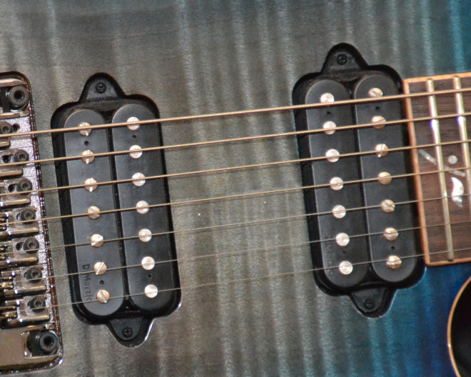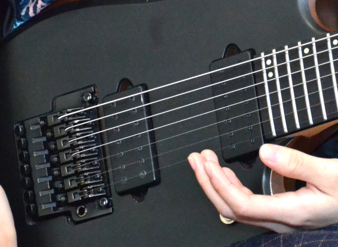葉月:7弦仕様のディマジオPAFです。以前使っていた6弦のj.customにはディマジオのTONE ZONEが載っていて、クラシックな雰囲気の音だったんですが、それに比べるとトレブリーでハイ抜けが良い音です。歪み方は、それほどエッジがあるようなタイプではなくて、わりとフラット。だから使いやすいです。ピックアップのセレクターは5ポジションで、色々な組み合わせができるようになっているんですけど、使うのはほとんどリアかフロント。リフやソロを弾くのはリアで、スウィープやアルペジオではフロントも使う、という感じですね。センターは、ほかのプロジェクトでは使うこともありますが、NEMOPHILAの曲では使っていないです。