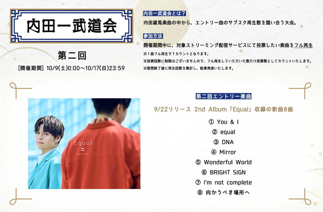 2021年5月にアーティストデビュー3周年を記念して第一回が開催された「内田一武道会」。今回は、最新アルバム『Equal』収録の新曲8曲が対象となり、各楽曲のサブスク再生数を競い合う。