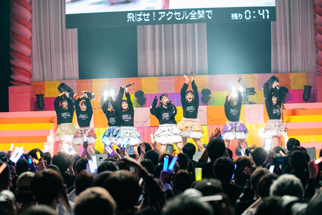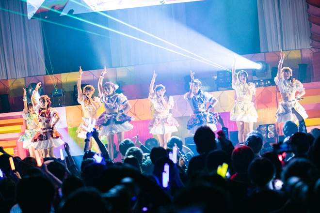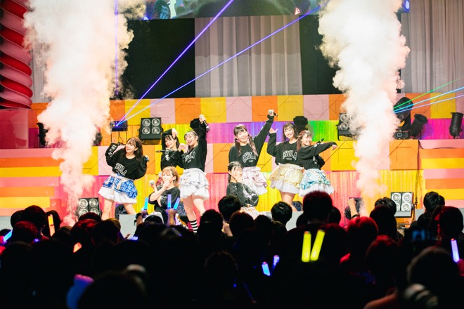 開演10分前よりステージ上のLEDにカウントダウン映像が流れ、開演時間16:30ジャストにオープニング映像とSEがスタートした。すると、この日、初お披露目となる新衣装でメンバーがステージに登場。“BPM200!超ハイテンポなアッパーチューンで元気を届ける渋谷原宿系アイドルユニット”を掲げる8人組だけに、1曲目の「ビバジャパン」からトップギアでステージを駆け抜ける。新型コロナウィルス感染対策のため、声を出しての声援は規制となるものの、サイリウム振りなどでファンも一体となり、メンバーの熱演に応えた。