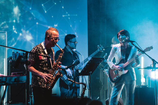 そんな“季節のシティポップ”を届けたあとは、“70年代のシティポップメドレー”と題し、EPO(オリジナルはシュガー・ベイブ)の「DOWN TOWN」へ。タンバリンを叩きながら快活に歌うLittle Black Dressのウキウキにつられて、客席のファンも気持ちよさそうに身体を揺らしたり、手拍子を送ったりしている。さらに、バックに青空の風景が映し出される中で歌った荒井由実「中央フリーウェイ」、ソフトメロウな尾崎亜美の「マイ・ピュア・レディ」と繋ぎ、ジャジーでファンクなノリが効いた大貫妙子の「4:00A.M.」では、メンバー紹介を兼ねた各パートのソロ回しを挟んだりと、セッション感でも会場を沸かせた。