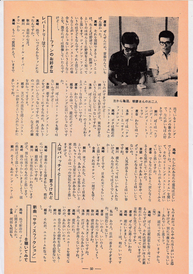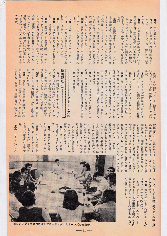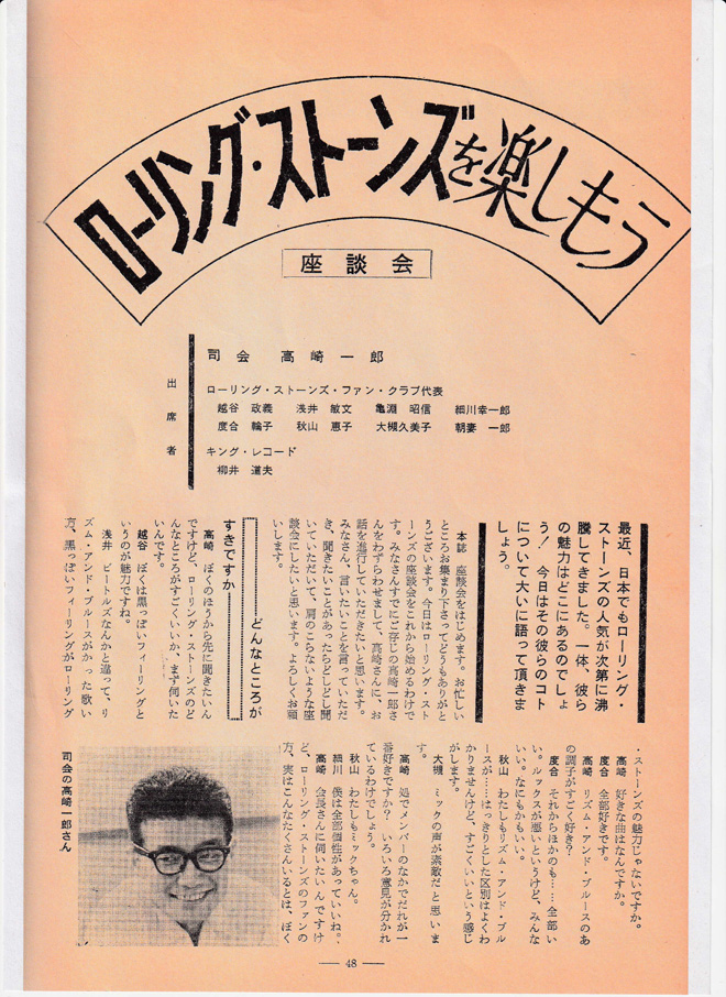 ▲MLのストーンズ座談会。2頁目の左から3番目が当時中3の筆者。その隣/一番右が高1細川幸一郎さん(初代会長、今でも大仲良し。近々このコラムで対談を予定している)。因みにML編集部からはその後僕のR&B師匠となる桜井ユタカさんがお見えになった。司会の高崎一郎さんとは90年代散髪屋が同じでよくお会いした。亀淵さん&朝妻さんの両大先輩には今でもお世話になっています。 from Mike’s Library