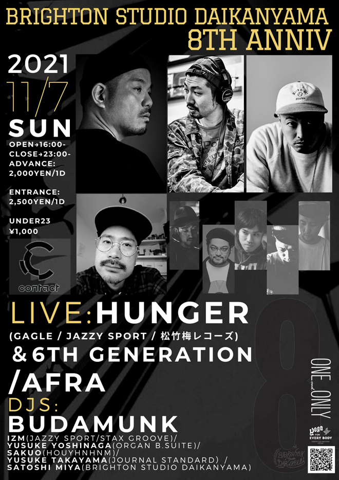 この祝宴にJAZZY SPORTからGAGLEのラッパーHUNGERがかけつける。現場を一閃するようなトーンと、グルーヴ感を生み出す圧倒的なラップスキルは音楽グルメなヘッズの欲求を満たし続けてきた。HUNGERが今回共演するビートメーカー、6th Generationとは強い脈絡がある。今や東北を代表するビートメイカーとなった6th Generationは、HUNGERが主宰するレーベル“松竹梅レコーズ”から発売された自身のマイルストーンともいえる2枚のアルバムにHUNGERを招いている。「火怨」「Authentics」「Stay Up」といったトラックの中の、両者の相互作用によって生み出された強烈な圧力や、立体的に広がる空間は、Contactのサウンドシステムとのセッションに大きな期待を抱かせてくれる。