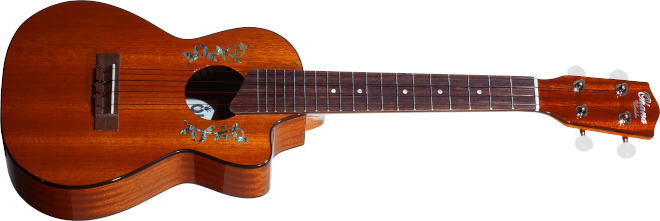 ボディー・トップ、サイド&バック、ネックはオクメを使用し、ボディー、ネック共にサテン・フィニッシュを採用し、スロテッド・ヘッドには、オープンギアのチューナーを搭載。サウンドホール・ロゼットは豪華なアバロンとブラック&ホワイトのパーフリング、ボディー・トップとバックにはオクメを使用したウッド・バインディングで装飾。フィンガーボードのポジション・マークにはフローラル・デザインを採用し、パーロイドのインレイが入っている。オハナ・ロゴ入りのギグバッグが付属する。