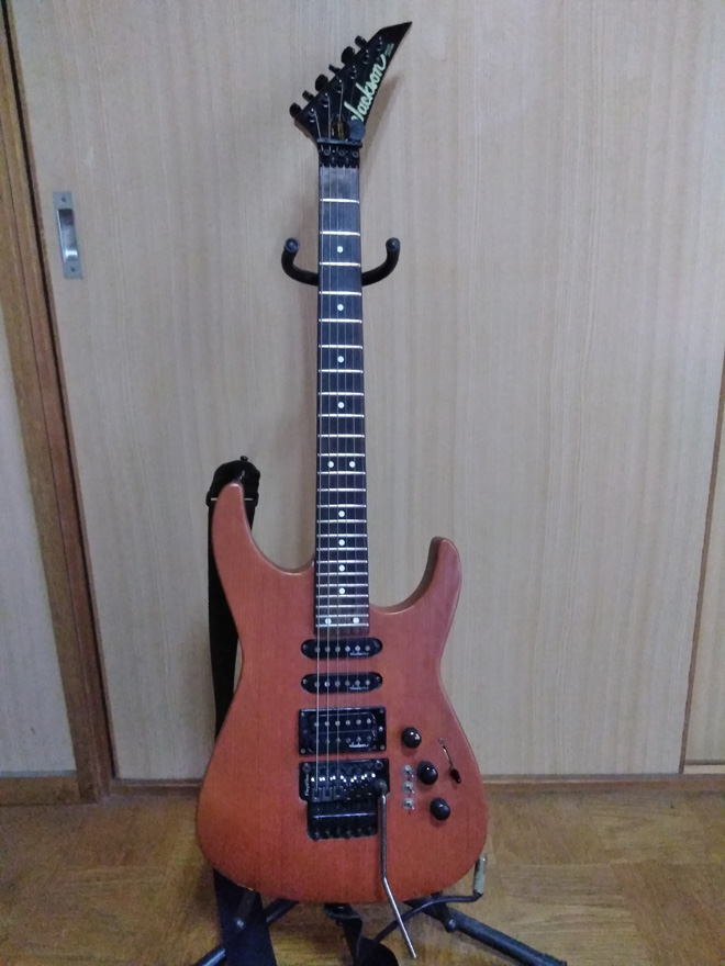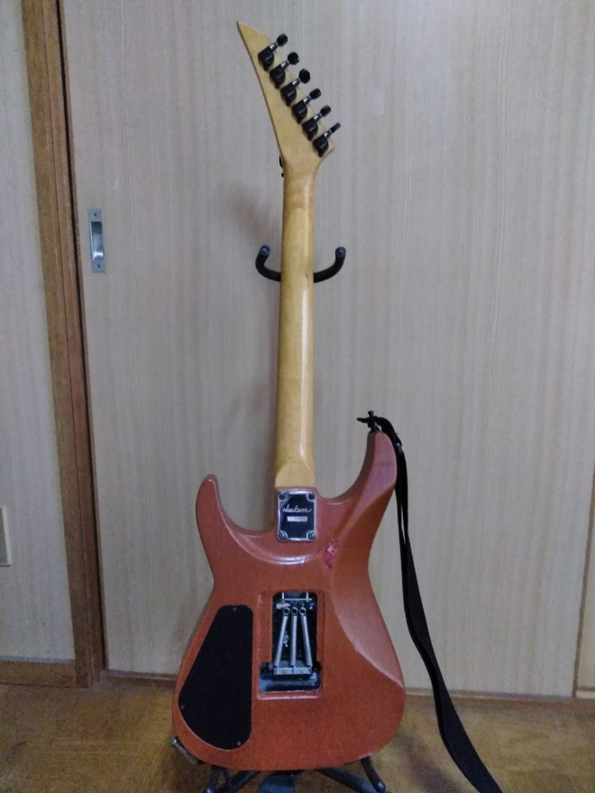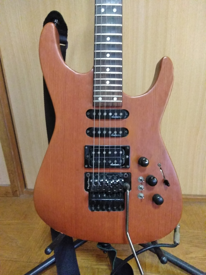 買って以来、もう30年になりますが、ブリッジは当時のタケウチからフロイドローズオリジナルに換装してリセスマウントに、黒色の分厚い塗装が気に入らなくて、全部剥がしてみたら木目が良くなかったので、マホガニー調?のカッティングシートでボディ全体を包んでいます。コントロールも色々と追加して、多彩なサウンドを出せるようになっています。