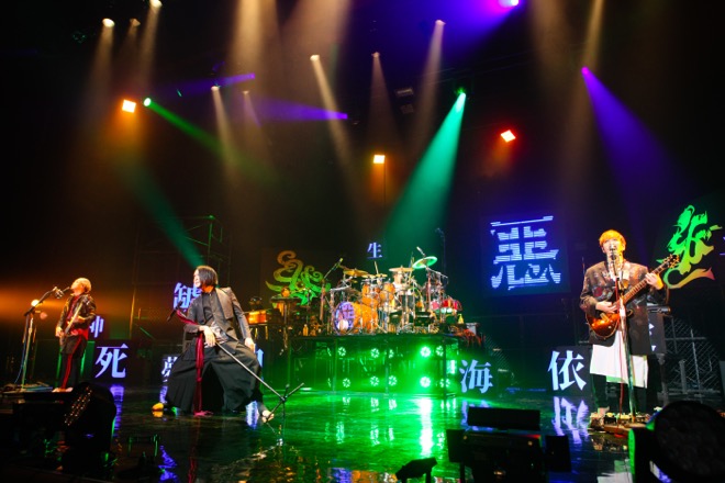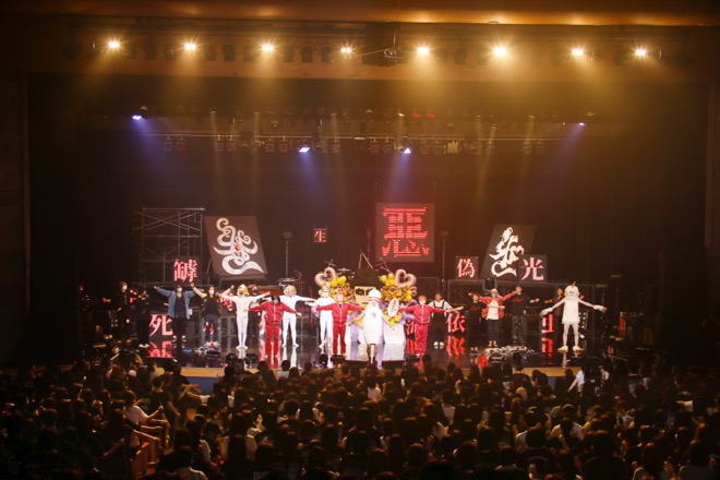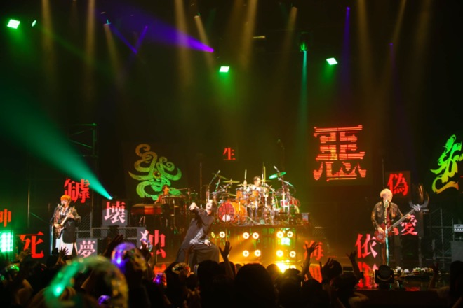 ダブルアンコールは、赤い光の中「1997」で重厚に幕開け。「茨城の歌で、ハッピーに終わりたいと思います!」とミヤ。ただでさえハイスピードなのに、「今のスピードじゃ終われねぇよな? もう1回! 行けるか水戸!」とミヤは煽り、更なるテンポアップに応じてプレイするSATOち。文字のオブジェを次々と投げ倒しながら、ミヤは「全部ぶっ壊そうぜ! 終わりは始まりでもあるんだ。受け入れて次へ行かせてくれ、俺たちを!」と叫び、「蘭鋳」がスタートした。逹瑯が全員を座らせた客席に向け、SATOちが「最後の“死刑宣告”、俺、夢烏好きだからな…“死刑”にしたくねぇよ、マジで。だけど! 未来に繋がるために、お前らを1回“殺します”。とりあえず最後の“死刑宣告”です。おーし、お前ら! 未来に向かってはばたくぞー! お前ら全員、死刑!」と叫び、各場所で低い姿勢で構えていたメンバーが大写しになる。「3、2、1」のSATOちのカウントで、しゃがんでいた観客共々ジャンプし曲が再開。歓声は上げられずダイヴもモッシュもできないが、そこには精神の解放があり、心地良いカオスがあった。