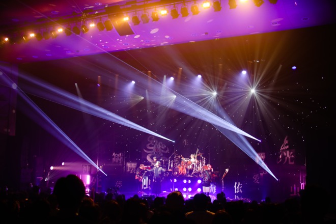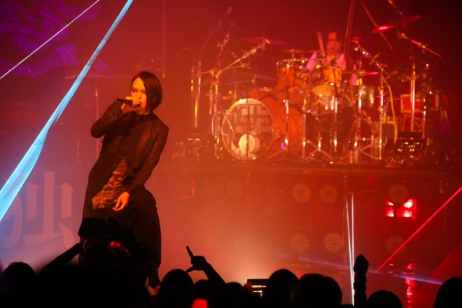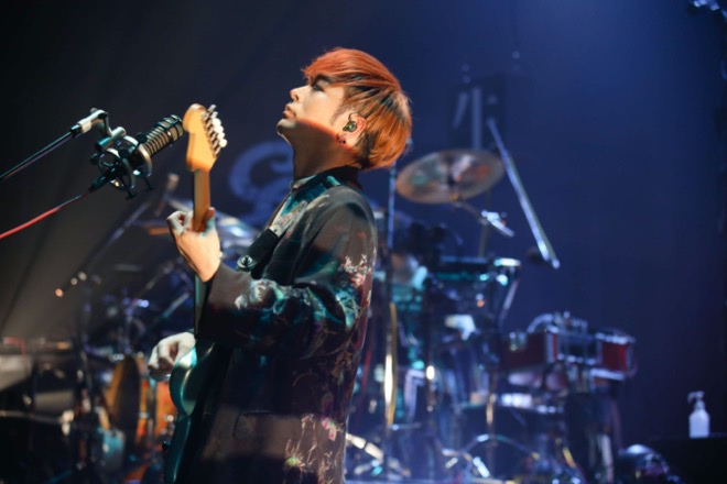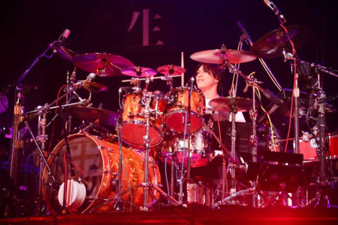 大きく身体を動かし、気合いの伝わるドラミングでスタートした「スイミン」で、ミヤとYUKKEは立ち位置を入れ替わり、ダイナミックなステージングを展開。ロカビリー調のギターリフとサポートメンバーである吉田トオルのピアノが絡み、YUKKEがアップライトベースを抱きしめるように構えてプレイする「Friday the 13th」へ。「SANDMAN」からはドープなゾーンへ誘うのだが、やはりこの曲でも“もっとずっと一緒に居たかったな”という歌詞にSATOちを重ねてしまう。ミヤの透明感のあるアルペジオから「パノラマ」へ雪崩れ込むと、ゆったりとしたテンポ感に酔いしれながらも、込み上げる感情を抑えきれないのか、顔をしかめ唇を噛み締めながらプレイするSATOちの姿に目を奪われる。大きな拍手の後、ピアノから「落陽」が始まり、一転してドラマティックに。直立不動で歌い出した逹瑯は、静と動の両極をエキセントリックに行き来しながら、物悲しい歌の世界へと引き込んでいった。星のような無数のライトがステージに灯り「アルファ」が始まると、白いレーザーが会場を包み込み幻想的な情景が広がる中、エモーショナルなドラムを打ち鳴らすSATOち。ミヤがギターソロを奏でている間、YUKKEはSATOちと向き合ってプレイ。最後は全員がSATOちの前に集まってフィニッシュ。オーディエンスはいつまでも熱い拍手を送り続けていた。