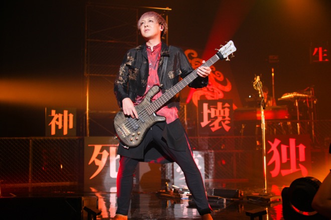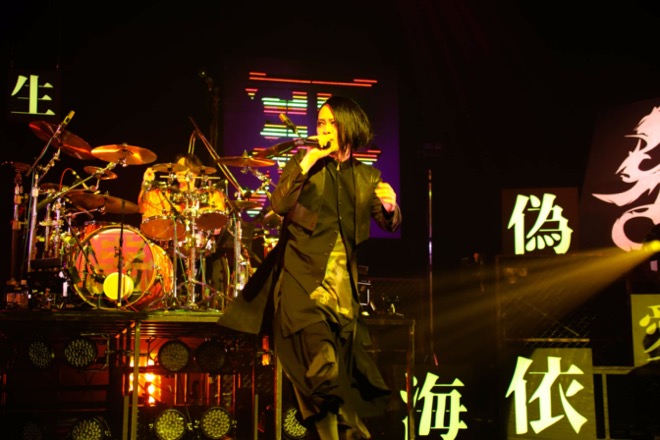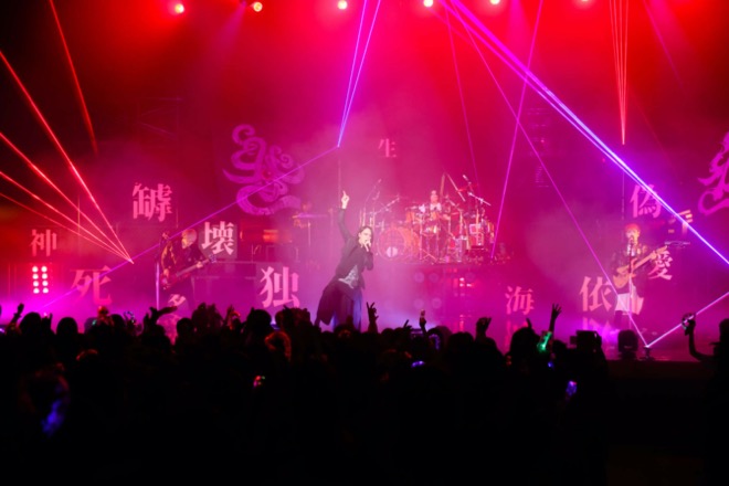 SEが流れる中、夢、愛、生、死といった文字を象ったオブジェの浮かび上がる仄暗いステージに、メンバーが登場。赤いライトの中、ドラムセットでスタンバイしているSATOちの姿が大写しになる。「惡‐JUSTICE-」から早くも感じ取れるメンバーの高いテンションと深い集中。「CRACK」「神風 Over Drive」と鋭く切り込むようなモードで曲を畳み掛けていく。「娼婦」の“君に会いたかったんだ”という歌詞は、会場に足を運んでいるファンに向けた言葉のように聞こえると同時に、この日は全ての“君”がSATOちに置き換えられるようにも感じた。ドラムロールからなだらかに「G.G.」へ突入すると、逹瑯、ミヤ、YUKKEが高くジャンプ。ミヤはカメラに接近し、画面越しのファンへとアピール。コロナ以前のライヴであればシンガロングやコーラスが聴かれたパートで、ファンは、グッズの鈴や各々に持ち込んだ打楽器を鳴らし、それぞれの方法で気持ちを表現。最後に敬礼するように手をかざす各メンバーがクローズアップされる。「海月」で逹瑯はひととき上着を脱いで腕を露わにし、滑らかな歌声を響かせた。ミヤの暗鬱なギターリフから「アイリス」が幕開けると、天上から差し込むようなグリーンのライトに射られながら、地の底から突き破るような咆哮を轟かせる。歌と演奏は小気味よく絡み合い、ライヴは勢いの良い滑り出しを見せていた。