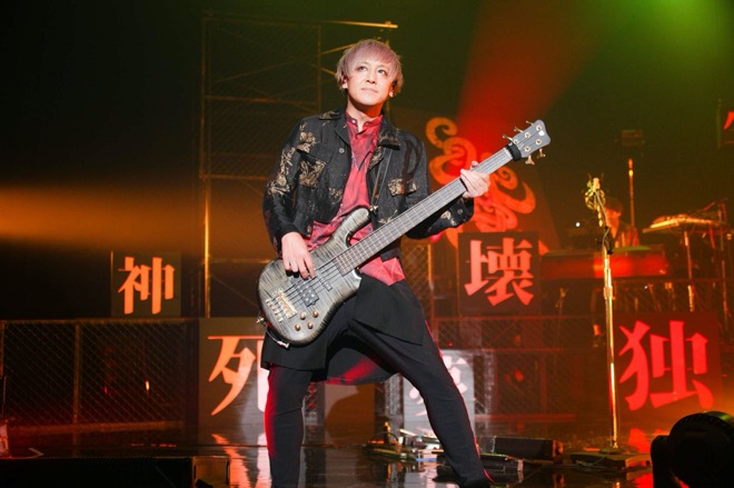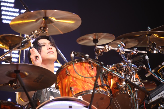 感動ムードが広がったところへ、布で隠された楽器をYUKKEが発表するコーナーへ。会場にそれと同じ楽器を持ち込んでいる人がいるか?を楽しむ恒例のコーナーなのだが、この日は鼓を持参したファンがいて、逹瑯は「いんの?!」と驚愕。珍しい楽器であるため鳴らし方が難しそうだったが、順に鳴らしてみるメンバーたち。SATOちが叩いた後、「叩きたい!」とミヤも受け取りに行き、好奇心旺盛な姿を見せていた。YUKKEは、「今日めっちゃ楽しくやれてますよ」とこの日の感覚を語り、「昨日の夜かな? すごくいろいろ考えて、ちょっと心配になったのね、“ちょっとヤベぇかも”って。でも、SATOちのほうへ行ってもSATOちもすげぇ見てくるし。一音一音楽しめてる感じが今日はしてる」とのこと。「打ち合わせとかしてないんだけど、いいポイントあったよね。全員がSATOちのほうを向いてる、とか。普段はそっち(と客席側を示す)に向けて表現してるのを、今日はこっち(SATOち側)に向けて表現してたよね。“いつ来てもいいんだぜ?”って」などと温かいコメントをするミヤ。「泣け!」などと逹瑯に茶化されつつも、「泣かねーよ!」とSATOちは応じ、「ここに訊いてくれよ!」と胸を叩いた。