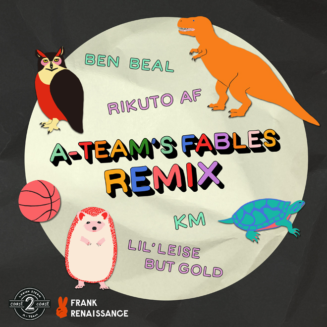 前回は楽曲リリースに合わせ、カリフォルニア在住アーティストLorien Sternがメンバーそれぞれをキャラクター化。そのキャラクターを基に、原宿に店舗を構えるcoast2coastがデザインを施し、アパレルコラボレーション商品として販売した。今回もこのタッグにより新作を制作、coast2coastの実店舗とWebで10月15日より販売開始されている。「A Team’s Fables Remix」は、バスケットボールと取り巻くカルチャー、そしてそれぞれのアーティストの個性が織りなすナンバー。また、レーベル・Frank Renaissanceは、今後も日米のアーティストの架け橋となる企画を続々とローンチ予定ということ。