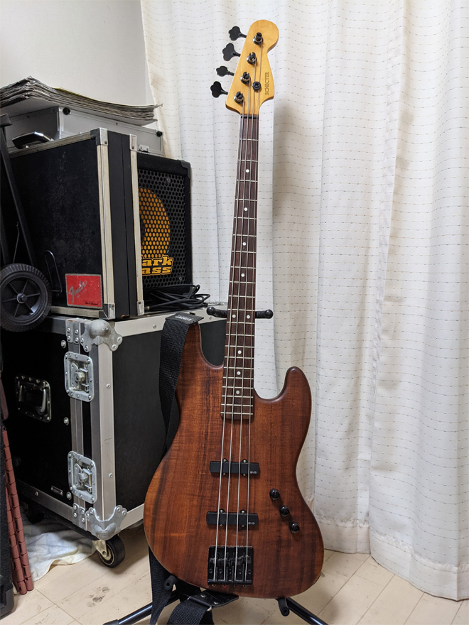 そこで、SCHECTERに頼み込んで、同じ仕様の(オイルフィニッシュのハワイアンコアのボディでEMGのピックアップ、バダスのブリッジを搭載した)ジャズベースタイプをオーダーしました。1990年の事でした。