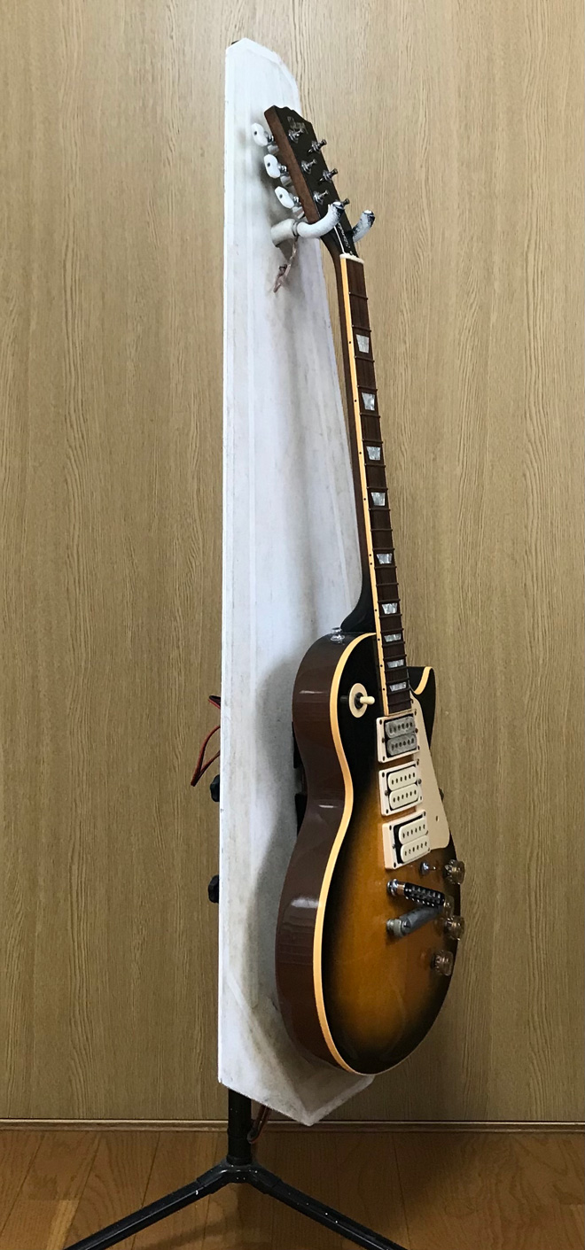 四半世紀ほど前に、KISSのトリビュートバンド(KISSDOLLS)で使うギターを探していたところ…地元、名古屋市内の楽器店で出会ったギブソン。エース・フレイリーが70年代に使っていた“スモーキングギター”を仕立てる前提で探していたゆえ、レスポールスタンダード・ブラウンサンバーストの一択。現在は、このコロナ禍ゆえライヴはままならず…ご覧のような状態でメインテナンス中ゆえ、絃は張られていない。