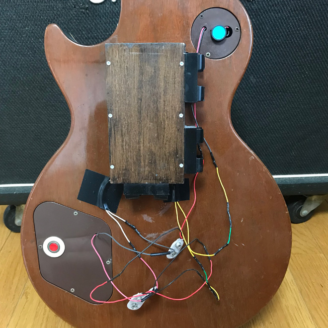 マシンヘッドは現行グローヴァーのパーロイド風のものに変更。元々のピックアップレイアウトにセンターを増設。ただし、リアこそディマジオ・スーパーディストーションが入っているが、ミドルはメーカー不明のハムバッカー、そして何より…フロントはトップが見えているだけで中身が無い。このギターが求める機能ゆえの、ダミーである。