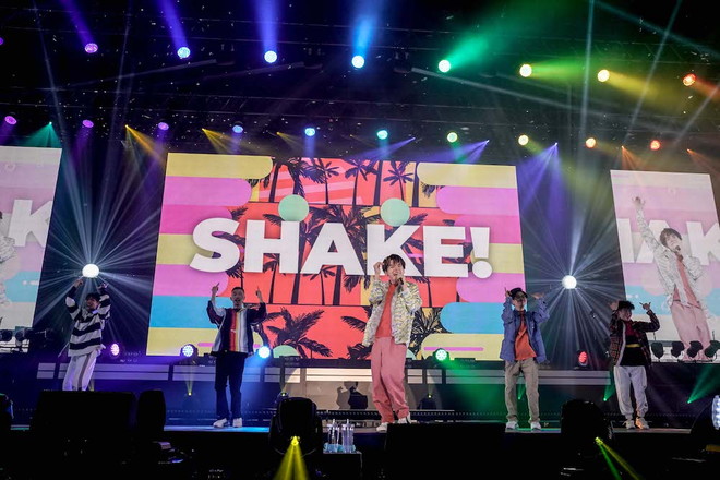 そして、そのまま「Buzzer Beater」のリミックスに乗せてウチダンサーズの紹介パートへ。会場の熱気が冷めやらないまま、今度はイエローとグリーンが鮮やかな柄シャツに衣装チェンジした内田雄馬が歌いながら登場。歌詞をアレンジし“これでダメならライブ見て忘れちゃおう”とファンキーに叫ぶ「Relax」に続き、自身初のオープニングタイアップとなったポップチューン「SHAKE!SHAKE!SHAKE!」を披露。ステージ上には4つのミラーボールが輝き、幕張メッセはパーティーホールさながらに。観客もペンライトを振って踊り、トロピカルでハッピーな空間が広がっていた。