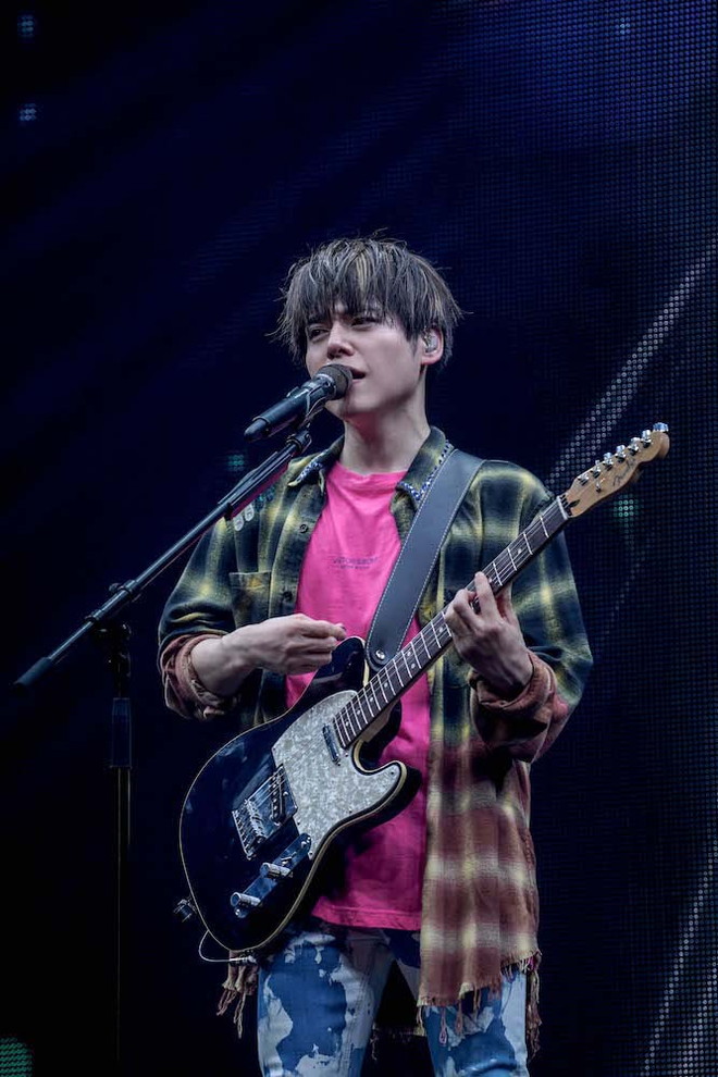 ライブ終盤戦は「Rainbow」からスタート。ホール上空に大きな虹が架かる中、チェックのシャツをさらりと羽織り、爽やかな歌声で魅了する。そして、ここでなんと私物のテレキャスターとスタンドマイクがステージに登場!内田のギターを合図に「BRIGHT SIGN」のイントロが響き渡り、初挑戦のギターをかき鳴らしながら、まだ見ぬ未来への希望を高らかに歌い上げた。