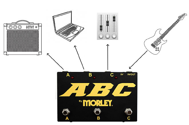 3つのインプットを1つのアウトプットにルーティングすることが可能。逆に1つのインプットを3つのアウトプットにルーティングすることもできる。これにより、1台のアンプを最大3本のギターで切り替えて使うこともカンタンにできる。逆に1本のギターを3台のアンプにつなぎ、同時に使用したり、1台を選択したりも可能。この接続の場合、ギターでアンプを鳴らしながら、PAなどの別系統へ信号を送るということも可能にする。