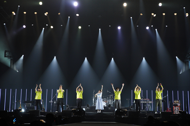 そしてアンコール3曲目は、中止となってしまった昨年のツアーに向けて作られた「僕らは今」。「去年できなかったけれども、そのツアーも引き継いで今があります。」とスタンドマイクを握りしめた。「みんなでこの時を一緒に生きる、という気持ちを込めて、この曲を歌わせていただきたいと思います!皆さんも心の中で一緒に大熱唱してください!」との声に呼応した手拍子に感極まりながらも、生バンドならではのソリッドなサウンドと軽やかな歌声で熱唱。大切に奏でた1年越しの楽曲は、客席のテンションをさらなるピークに導いた。