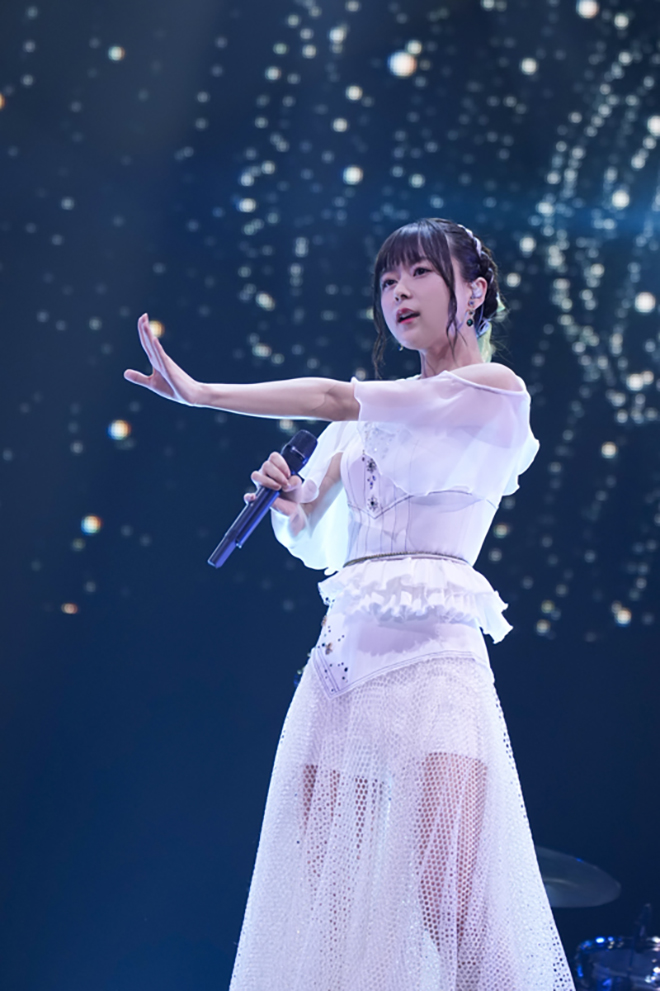 白い布がひらめくロングスカートスタイルに衣装替えした水瀬が披露したのは「クリスタライズ」。曲名の通り、クリスタルのようなビジューが胸に煌めく。交錯する時間を歌う詞とリンクした、秒針のような振り付けが印象的だった。次の「Well Wishing Word」では雰囲気が一転、スカートをひらめかせながら笑顔いっぱいに手を振りポップなダンスで観客を魅了した。