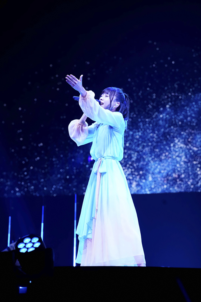 疾走感あふれる楽曲を畳みかけるように歌い、全力全開の熱量で観客を熱狂させた水瀬は一旦ステージを後にする。暗転した舞台に星空が広がり、5周年を記念して作られた「Starlight Museum」のイントロのピアノが奏でられる。会場が静かに水瀬を待つ中、可憐なピンクのワンピースに身を包み再登場。「この曲は皆さんが一緒に作り上げてくれるペンライトがあって完成されると思うので、星空のように美しい光をありがとうございました!」と支えてくれる人たちへの感謝を込め、涙で目を潤ませるシーンも。美しいハイトーンと胸を揺さぶるようなビブラートを聴かせた。