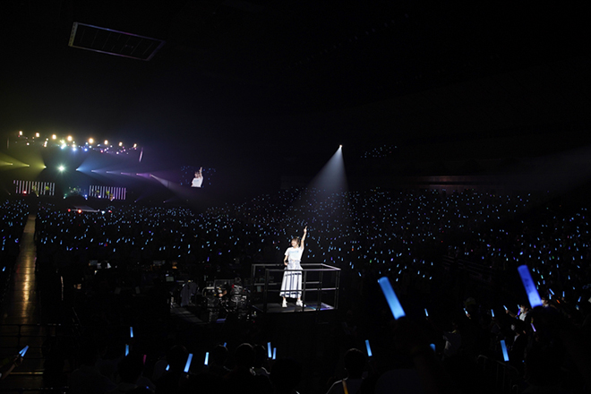 ここからはライブ初披露となる3曲が立て続けに繰り出される。「思い出のカケラ」では客席の隅々まで手を振りながら爽やかなパフォーマンスを見せる。そしてアリーナ中央のステージいっぱいに焚かれたスモークが雲のようになった中で、ゆったりと揺れながら歌ったのは「ソライロ」。続く「茜色ノスタルジア」では空が変わるようにステージが夕暮れ色に染まり、情感たっぷりに伸びやかなロングトーンを響かせた。