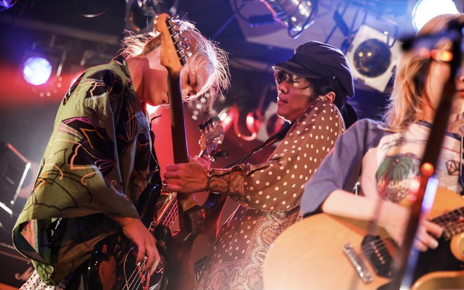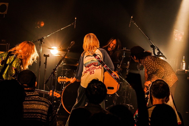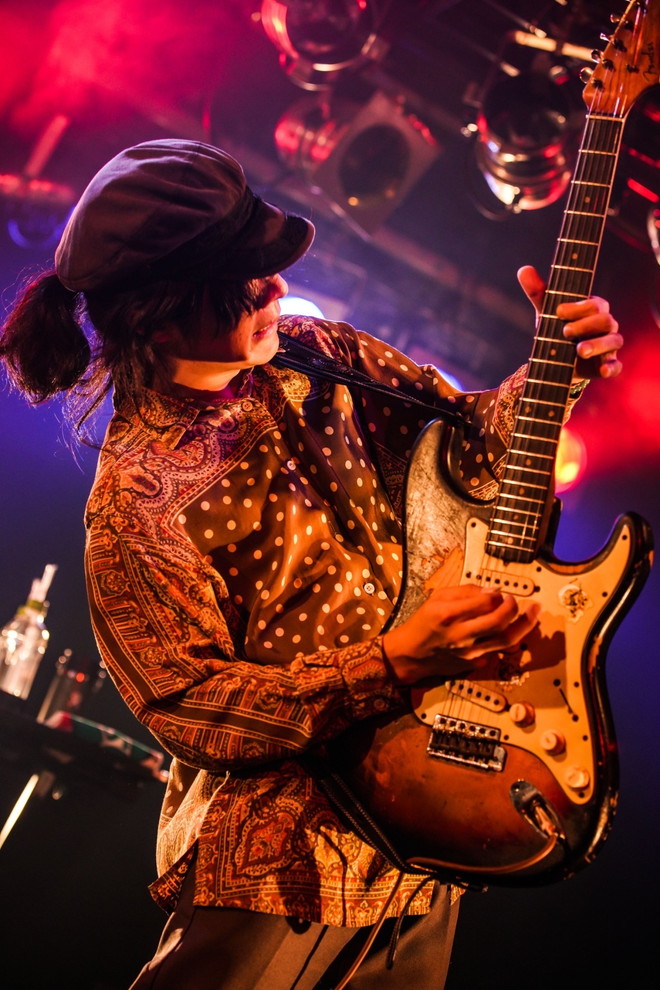 冒頭の2曲を終えてメンバーそれぞれが挨拶を行うと、同道のソロアルペジオから流れ込むように「ついてない」へ。ステージは夕陽に似たオレンジの照明に照らされ、曲調はセンチメンタルなギターロック。J-ROCKの王道と言える趣の楽曲だが、ファンクやブルースをルーツにした肉体性に溢れたバンドのプレイは、誰もが聴き親しんだ“邦ロック”の形式から跳躍してバンド独自の音像を刻んでいく。