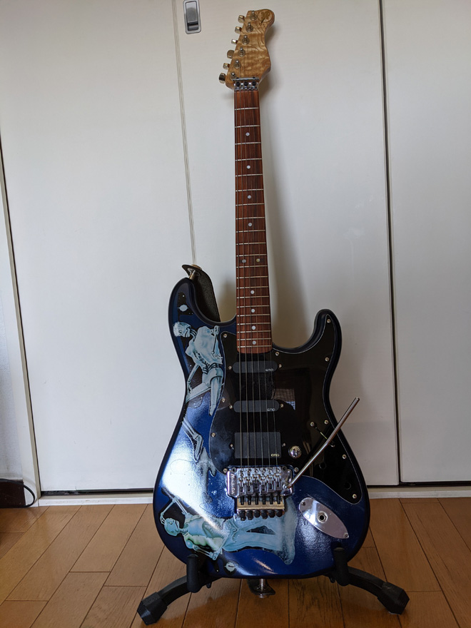 ボディ、FRタイプのブリッジはメーカー不明のありモノ、バークレー(ローズ指板なのにスカンクライン有り(笑))のネックはヘッドをヴァレーアーツ風に改造。デザインはネットの画像をダウンロードし縮尺を調整の上転写シートに印刷し貼り付け。便利な世の中になりました。塗装は車用のメタリックなダークブルー。