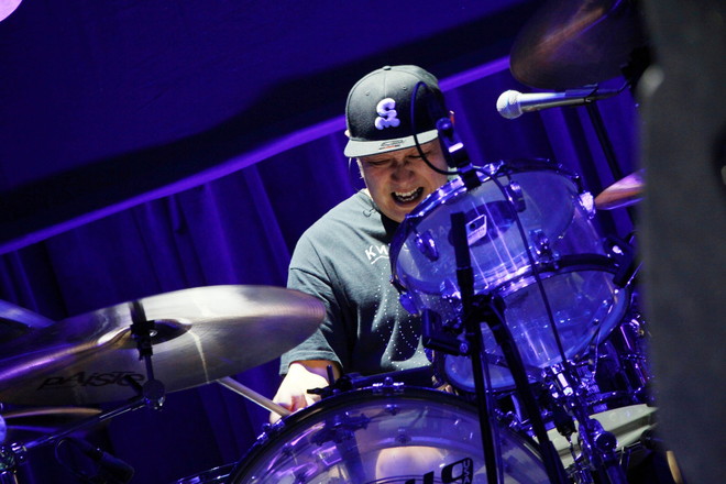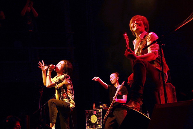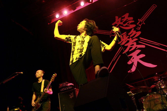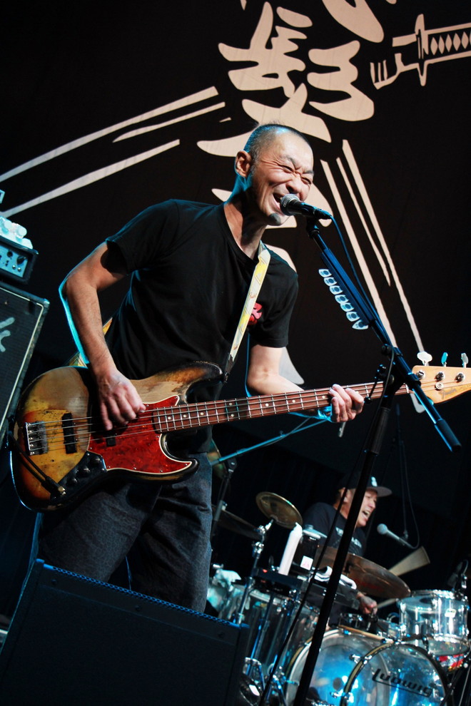 増子直純(Vo)の威勢の良い掛け声とともに「独立!俺キングダム」で宴は始まった。いつもはリーゼントをコームで梳かして……という増子だが、東京に出てきて30年、12月リリースの再録アルバムに合わせ、「昔を思い出してもらうために」と髪を伸ばしているとのこと。サラサラロングヘアを振り乱しながらダミ声を高らかに浅草の空へと響かせる。