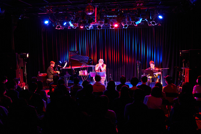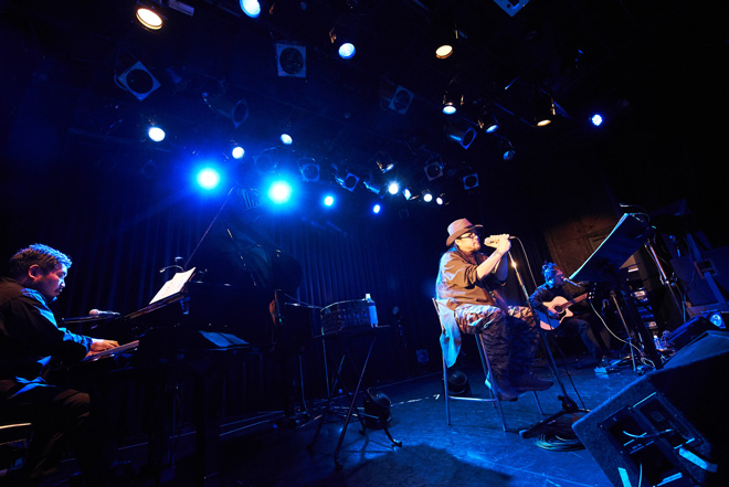意外と楽曲との相性が良くて違和感なく楽しめたのが、奥田民生の「悩んで学んで」。鼻に抜ける声の配分やアイロニカルな歌い回しなど、けっこう二人の共通点が多くてびっくり。また、平田崇のリズム感が光っていたのが中島みゆきの「難破船」。スパニッシュ色を出した彼のカッティングは、本当にいつ聴いても鮮やかの一言に尽きる。一方、田中佑司のピアノも演奏の個性では引けを取らない。産休中の森美夏に替わって登場した田中だが、ブレイヤーとしてはけっこう攻めるタイプ。アレンジは基本これまでと大きく変えていないのだが、本当にちょっとしたところでアクセントが生まれる。例えば「濫觴」では、スケールからアウトする感じや微妙なコードの当て方も森美夏の演奏とはまた違っていて、同じ曲でも演奏者によって印象が変わるもんだなぁと感心した。
